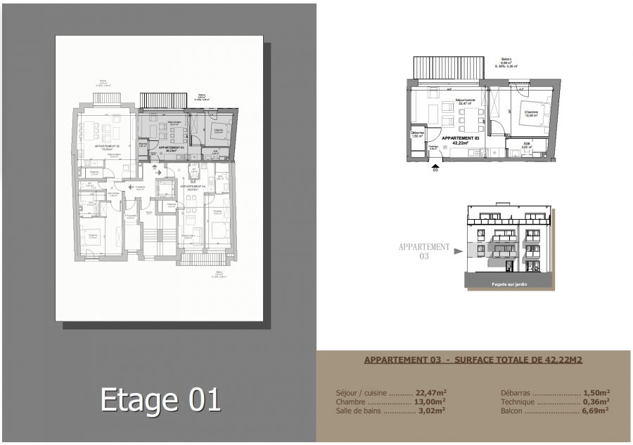 À l'intérieur de l'appartement d'une surface nette de 42,22 m2 :
