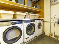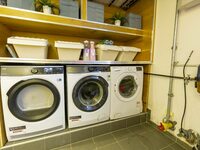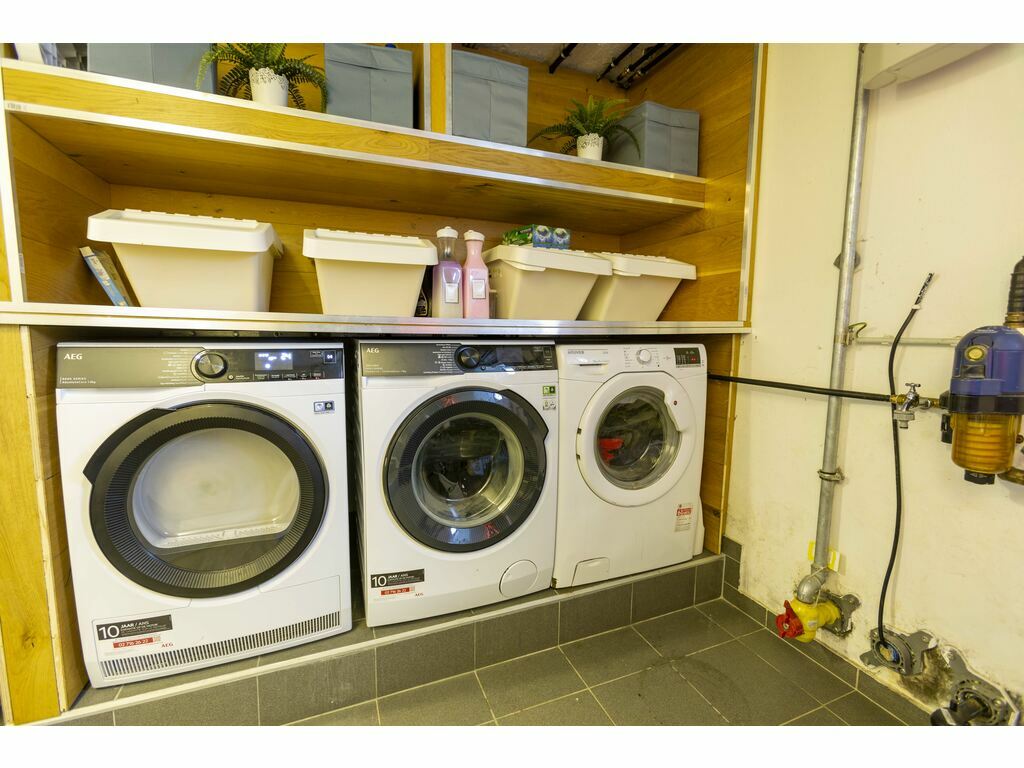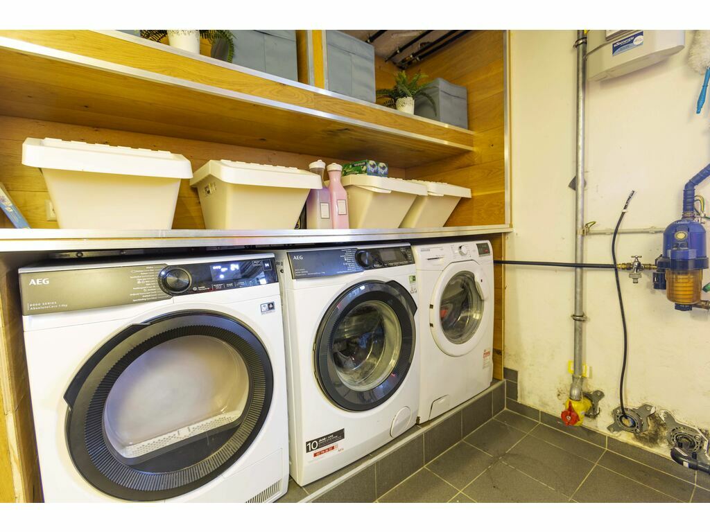 En rez-de-jardin, le sous-sol offre un garage (17,36 m²), une buanderie (12 m²), une salle de douche (6,19 m²) et une cave (14,83 m²).